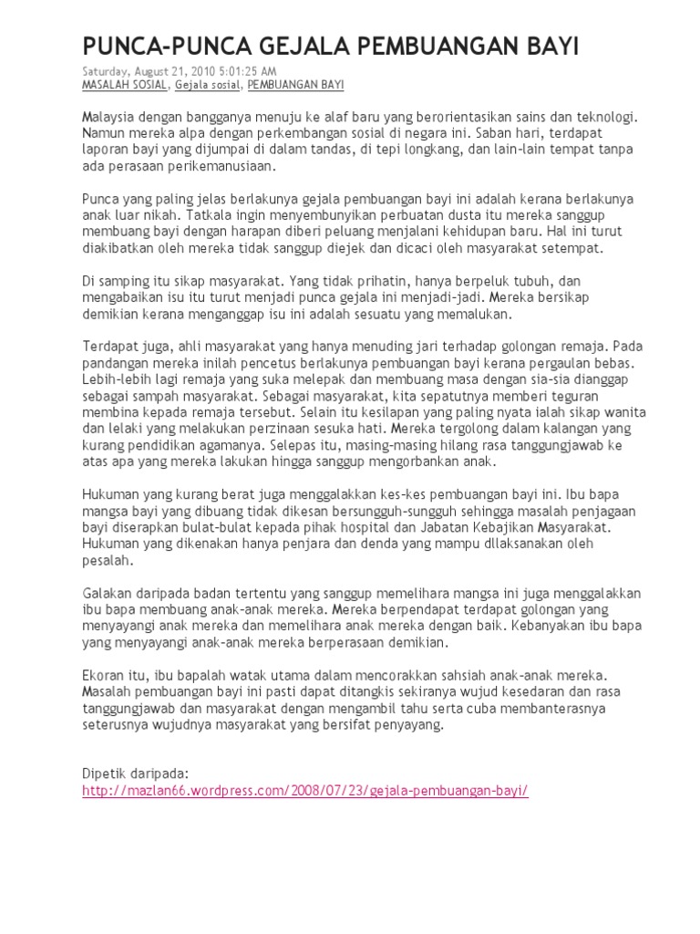 Namun begitu di sebalik kegemilangan ini masyarakat Malaysia masih dihantui satu penyakit sosial yang sudah. Tetapi tindakan pembuangan bayi akan memberi banyak kesan yang buruk. Isu Pembuangan Bayi Masalah pembuangan bayi bukanlah merupakan satu perkara yang baru berlaku di negara ini.