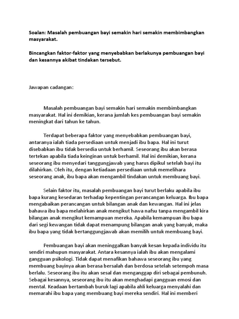 Faktor-faktor lain adalah. Faktor pembuangan bayi harus dipertimbangkan dengan teliti bagi mencapai penyelesaian sebenar kepada masalah ini. Pelbagai faktor yang menyebabkan kes ini semakin menular dalam kalangan remaja.